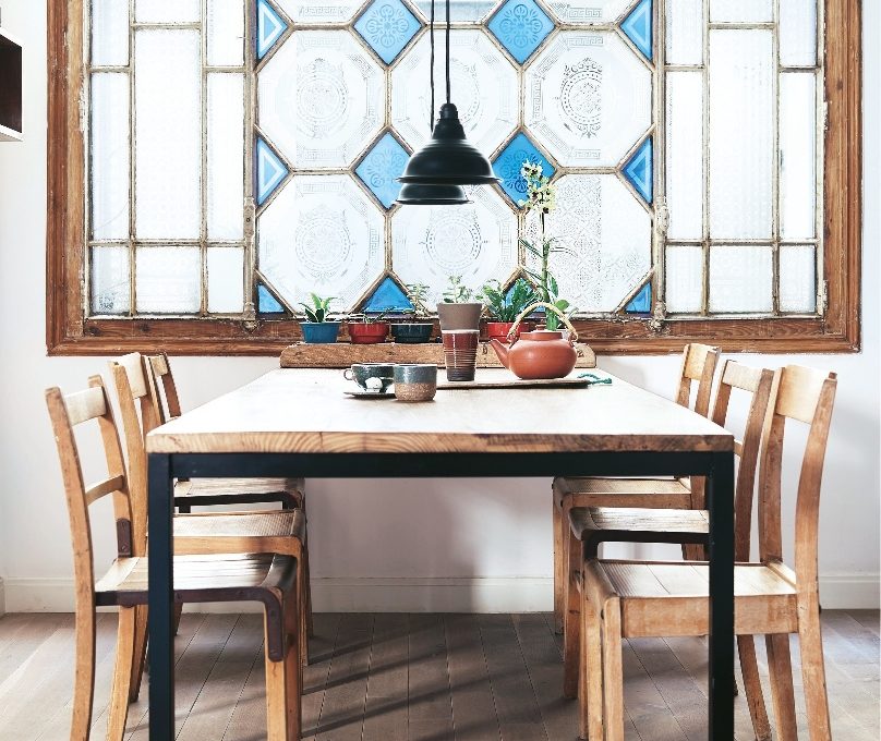 Arredi poveri-ma-poetici si mixano nella zona pranzo: un accogliente angolo con rimandi e suggestioni lontane. Il tavolo di ferro sfoggia un top in legno di castagno di recupero realizzato da Antique Boutique su disegno di Barbara. Le sedie in stile inglese sono state acquistate su eBay, le sospensioni sono di Habitat (e ridipinte di nero). A parete, vecchie scatole diventano contenitori per i ricordi di viaggio. Incornicia la sala da pranzo la vetrata artistica a piombo, pezzo originale della casa.