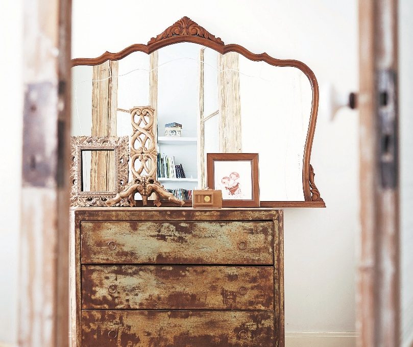 Un mix&match di charme sul filo del recupero. È così che Barbara reinterpreta i vecchi mobili e dà vita a composizioni nuove che conservano però intatta la patina del tempo. La vecchia cassettiera acquista infatti personalità con la specchiera in stile, la cornice acquistata a Bali e gli intarsi di legno recuperati da vecchie sedie. Piccole sculture da esibire.