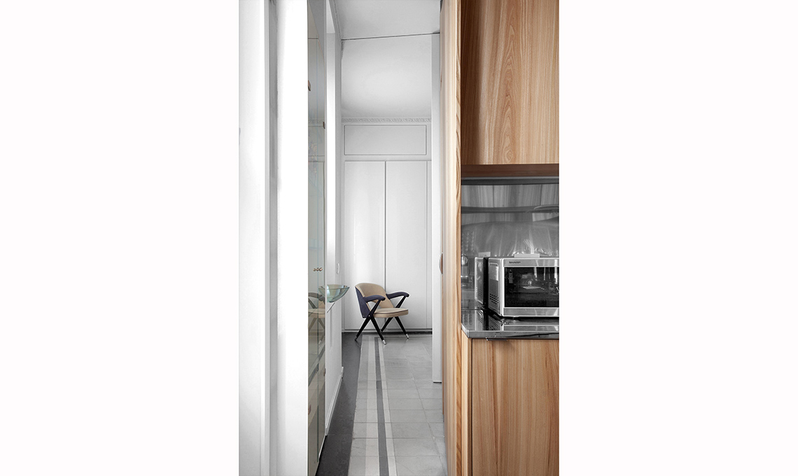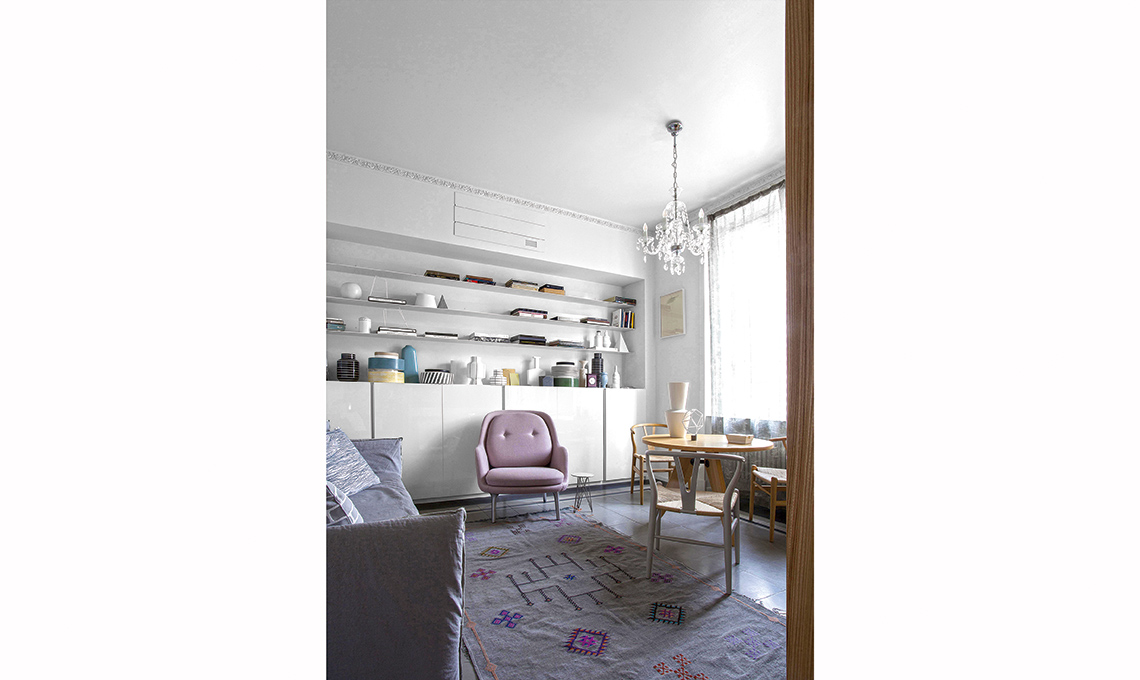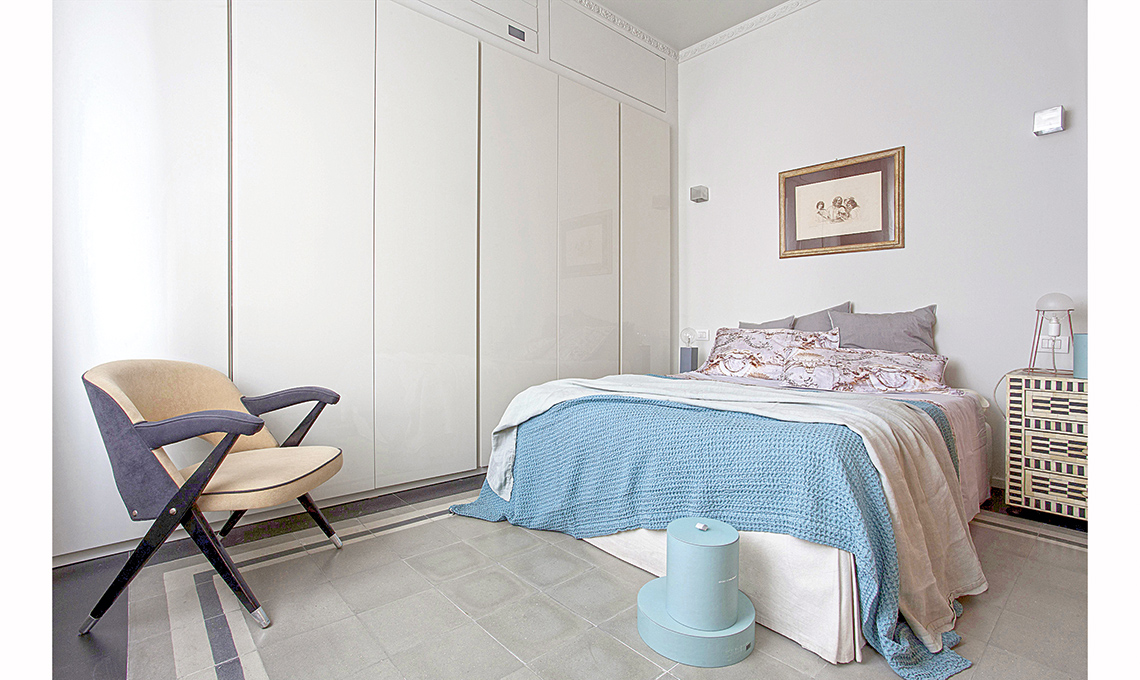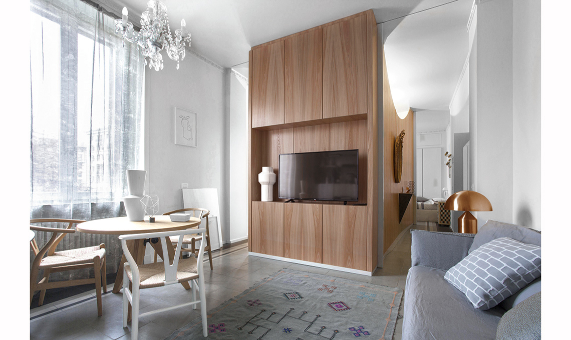 L’appartamento è di circa 45 metri quadrati, ma sembrano molti di più perché niente è lasciato al caso. Intelligenti soluzioni contemporanee salvaspazio sono accostate a elementi di arredo e finiture in stile vecchia Milano. In camera l’armadio a muro a tutta parete integra lavanderia e impianto di climatizzazione, mentre la pavimentazione in marmette e cementine e gli stucchi reinterpretati e realizzati sulla base delle modanature d’epoca a soffitto compongono due cornici sobrie ma piene di carattere, che corrono lungo tutto l’appartamento.