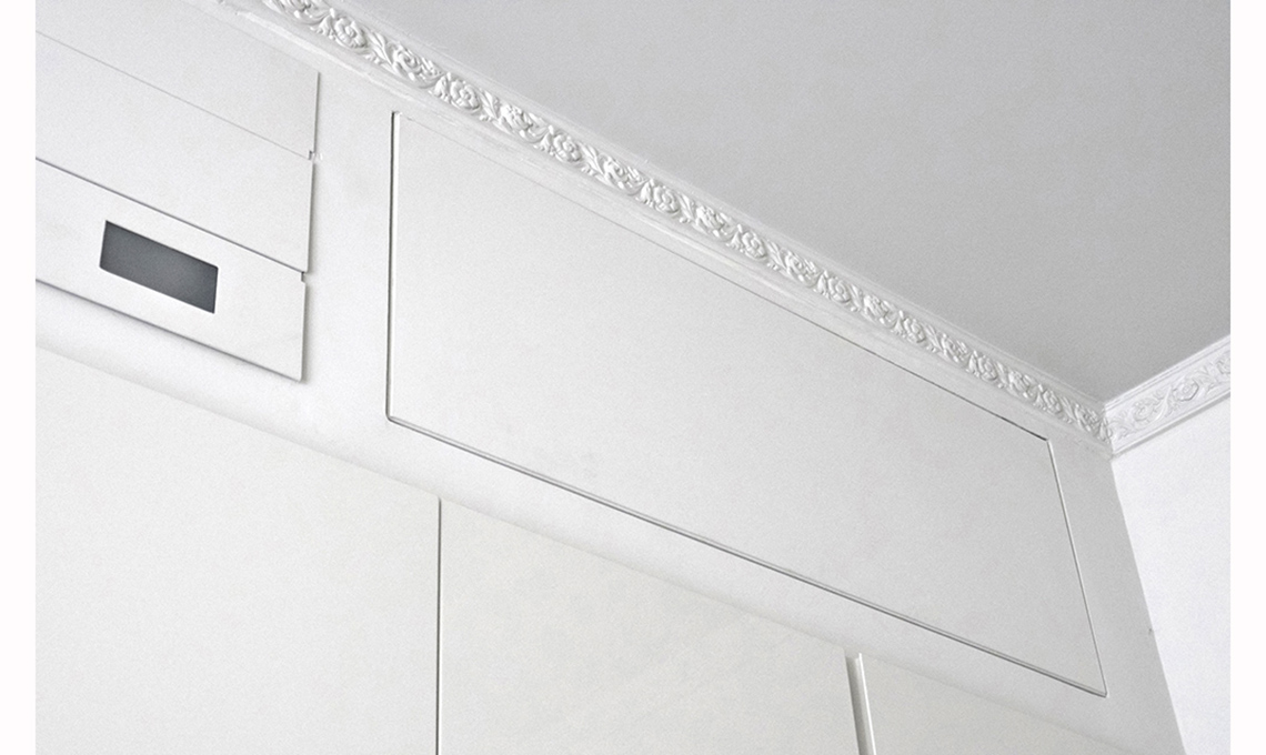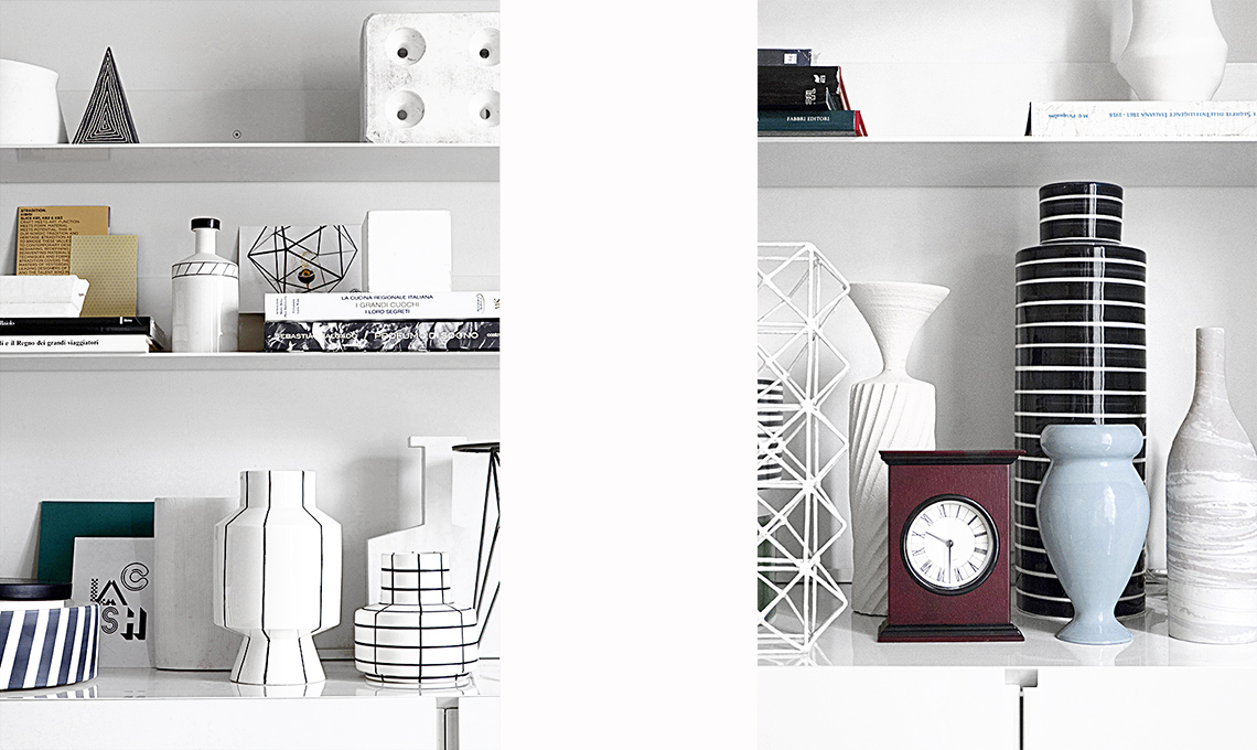 in moduli minimal in legno laccato bianco, e la parte alta alleggerita da tre file di mensole ipersottili in metallo, fatte su misura.
