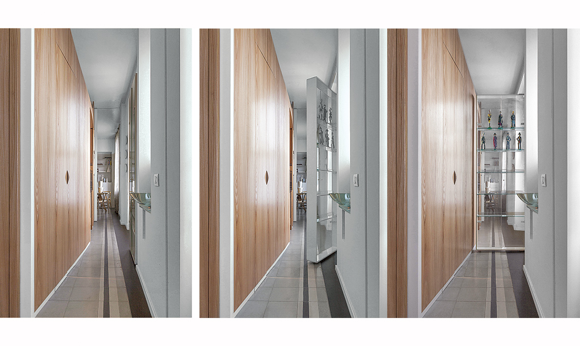 Gli spazi intorno alla scatola hanno funzioni molteplici: su un lato corrispondono alla zona ingresso, mentre su quello opposto diventano parte integrante della cucina e del bagno. Qui trova posto persino un antibagno con lavabo, che si può schermare ribaltando una scaffalatura a ridosso della parete: è una vetrina leggerissima, un elemento filtro formato da un telaio in legno laccato bianco a cui sono fissate mensole in vetro molate su misura (nelle foto della pagina a fianco vedi la vetrina chiusa e semiaperta). Il posto perfetto per accogliere oggetti da collezione!
