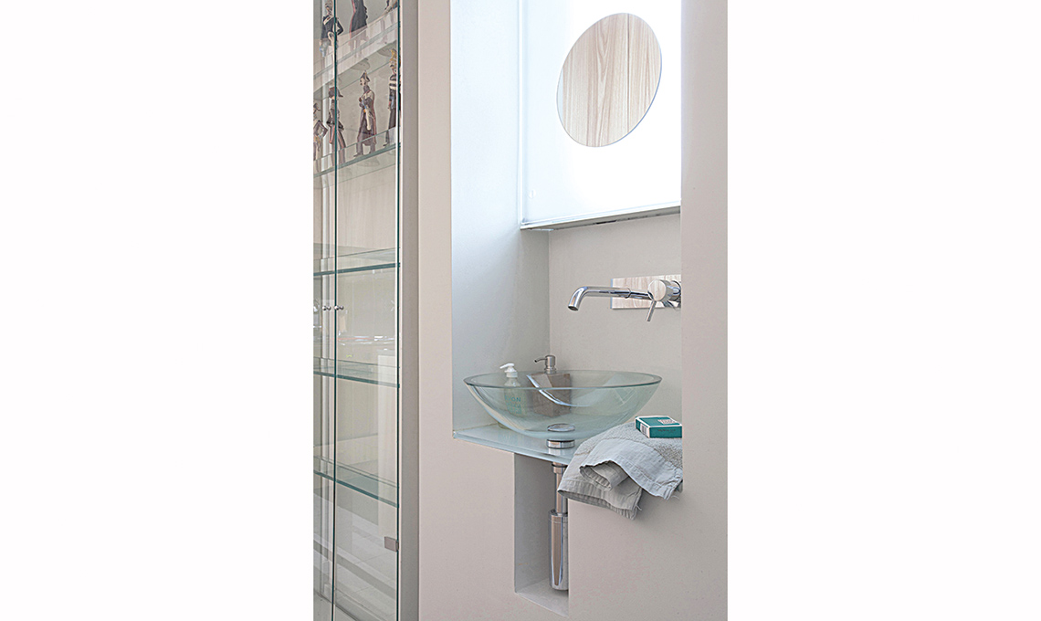 (la vetrinetta e il lavabo) amplificano lo spazio.