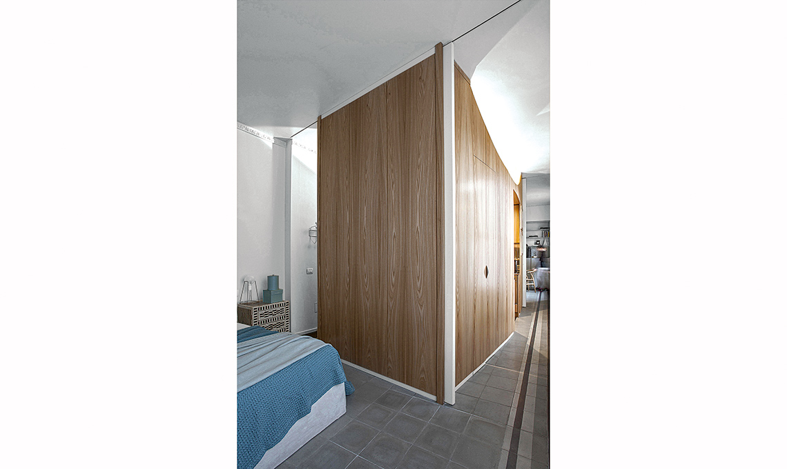 Prima di tutto, per una casa contemporanea, c’era bisogno di uno spazio più fluido:via vecchie partizioni e addio al tradizionale concetto di stanze. Liberato lo spazio, con l’aiuto di cerchiature di rinforzo e putrelle nascoste nel controsoffitto, la brillante idea degli architetti romani è stata di concentrare i servizi in un volume compatto al centro dell’ambiente, che separa la zona giorno dalla zona notte senza interrompere l’open space. La struttura, realizzata in muratura e rivestita in olmo naturale, ha un disegno sapientemente sagomato, che valorizza i passaggi laterali senza ridurli a banali corridoi.