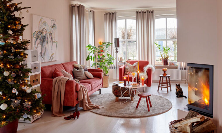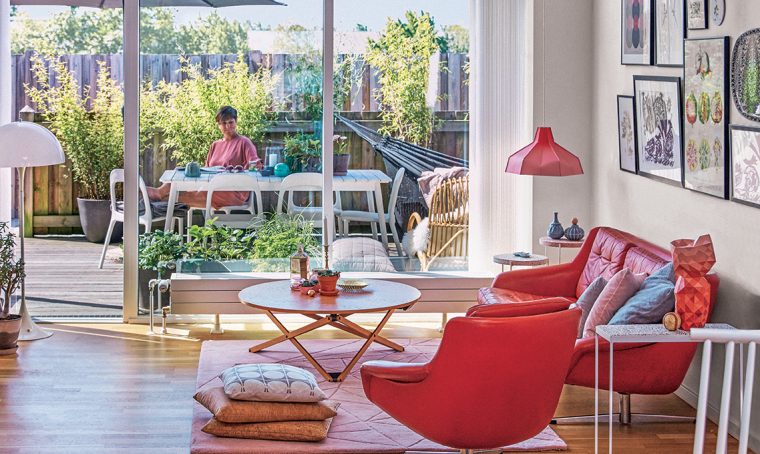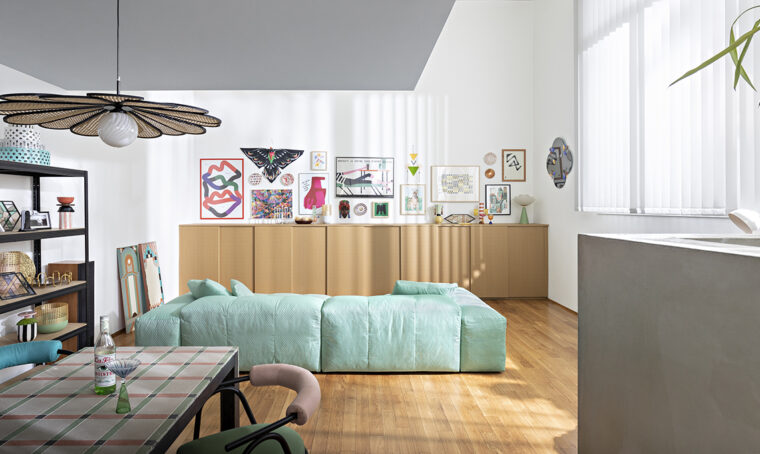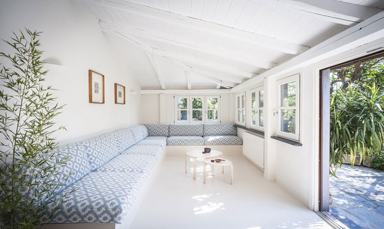 La veduta del soggiorno evidenzia come la casa sia stata studiata per essere in dialogo con l’esterno: dal divano si gode della vista del giardino attraverso un’ampia portafinestra. Le tonalità soft