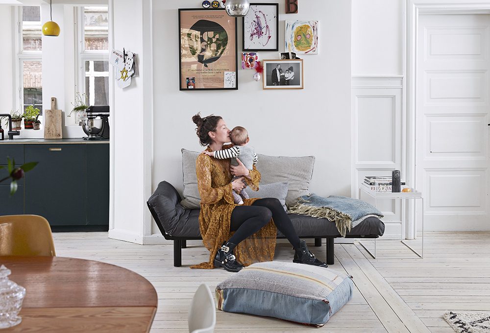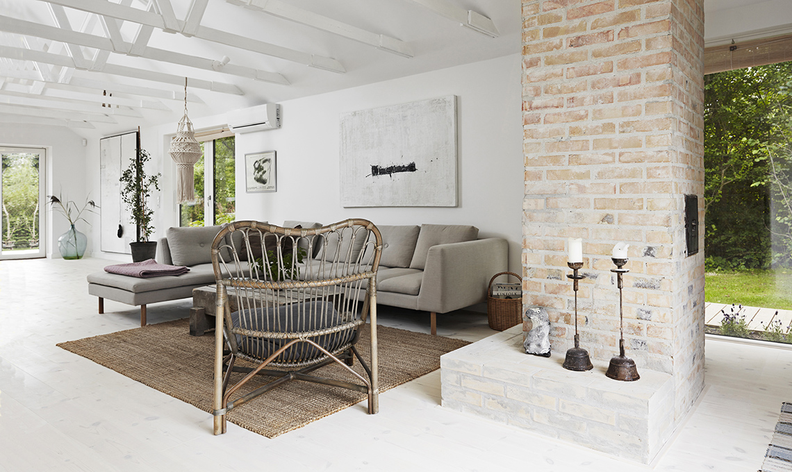 Divano simile ai mod. Brooke e Missouri di [Maisons du Monde], tappeto in juta come Lohals di [Ikea, cm 160x230 € 79].