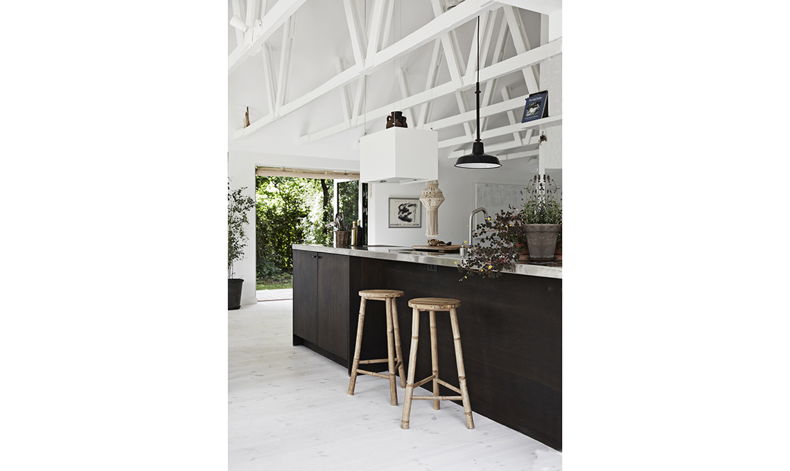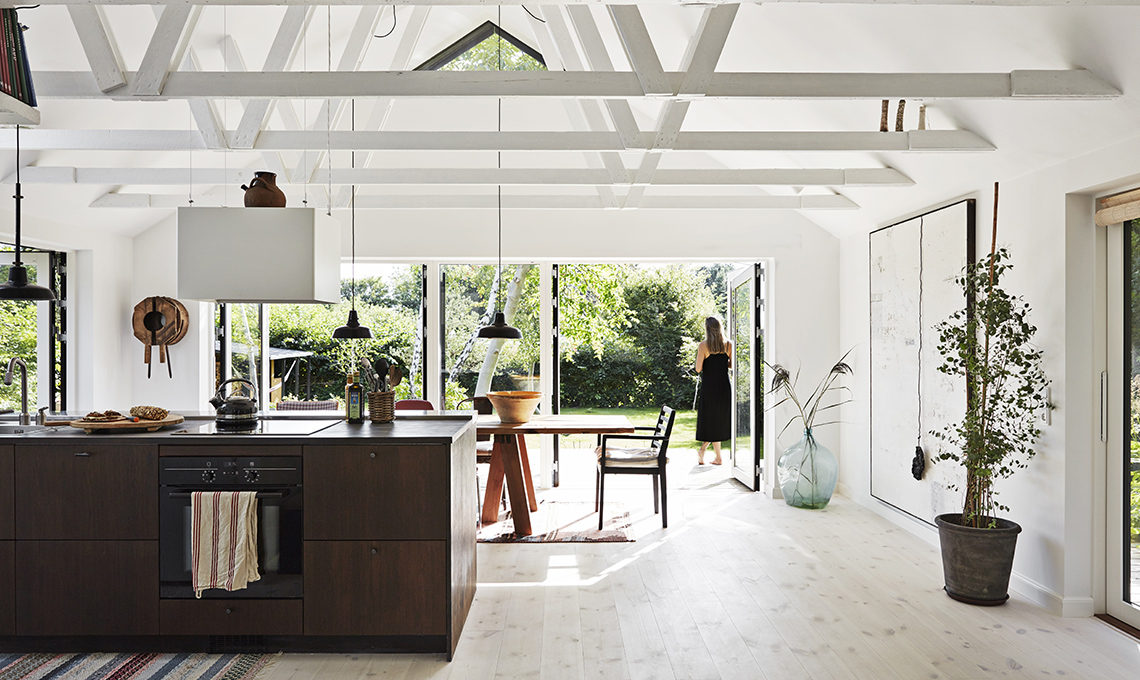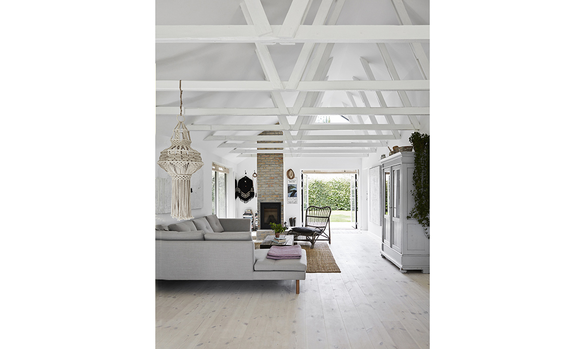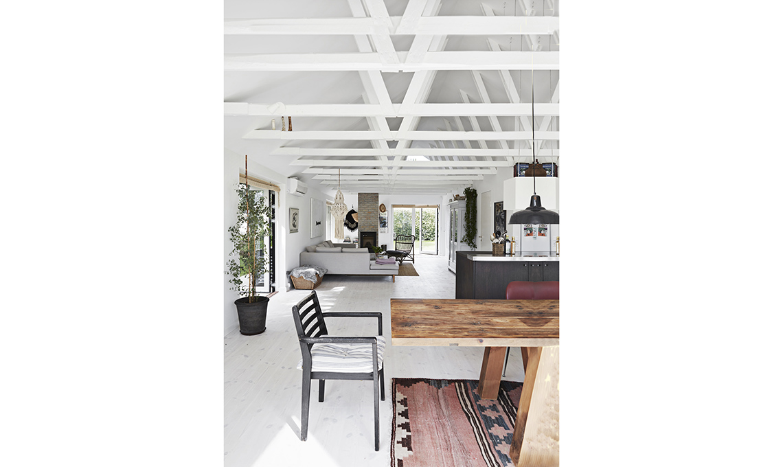 Le grandi capriate che caratterizzano tutta la zona giorno, tinte di bianco come soffitti