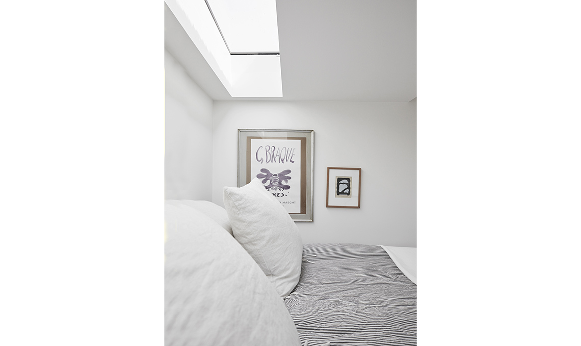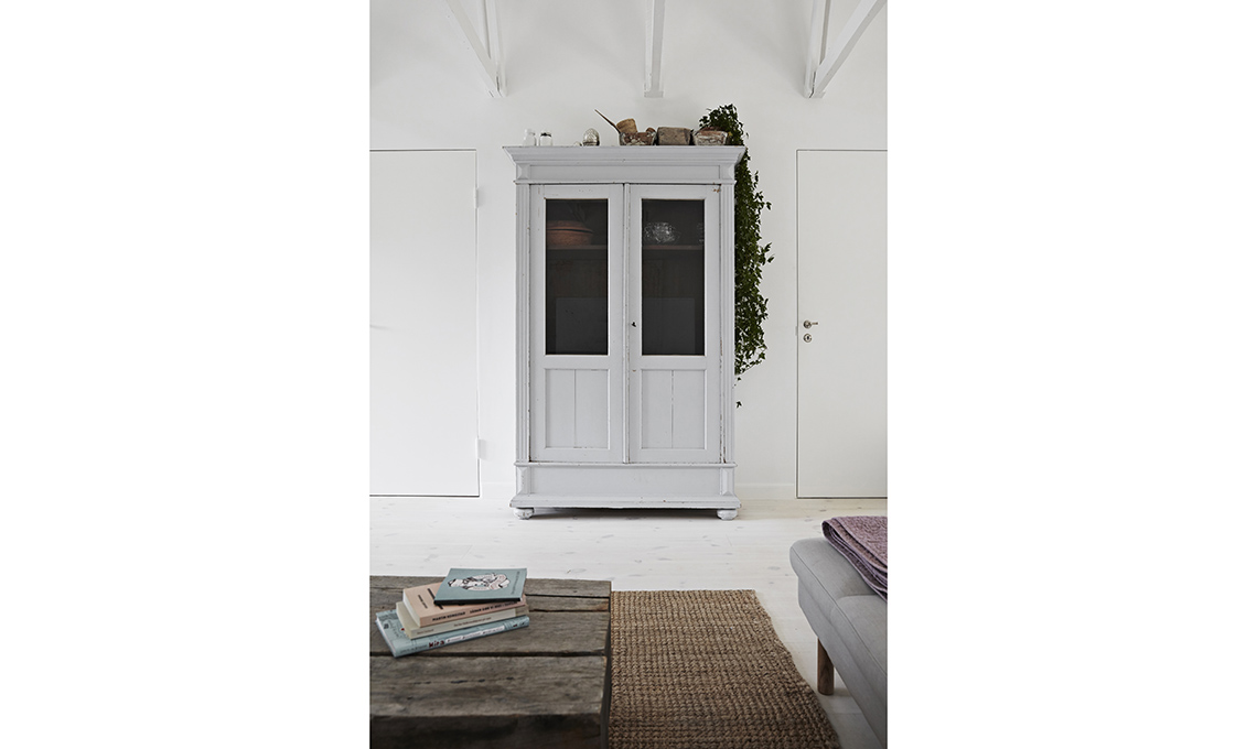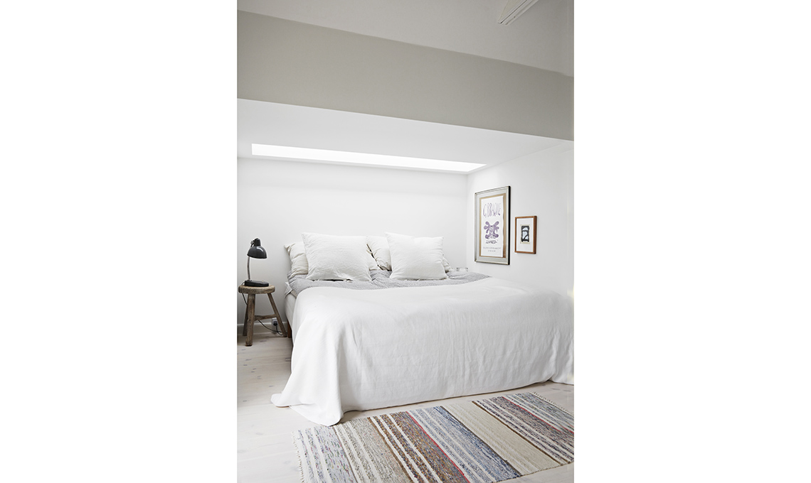 Nel tutto bianco, il tocco di stile è dato dal rimbalzare delle diverse tonalità di beige tra sgabello, cornici e tappeto.
