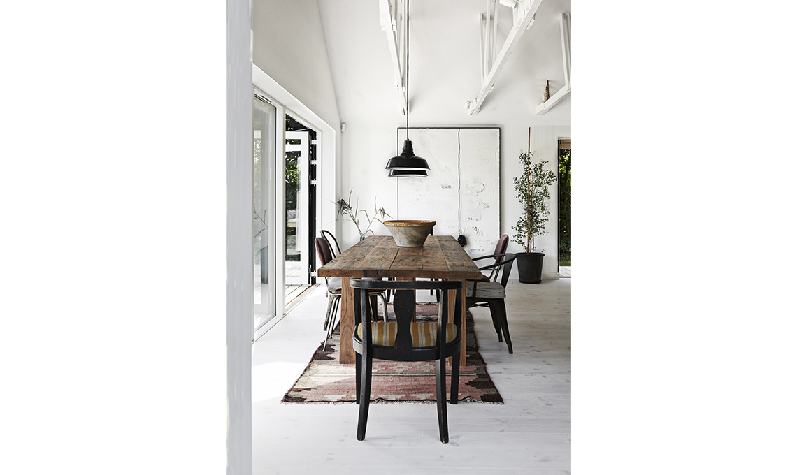 Sospensioni in metallo simili al mod. Uma di [Rossini Illuminazione, ø cm 40 € 169,70]. Lampade industrial Le vuoi vintage? Cercale da [Neoretrò] e [Magazzino76]. Tavolo e tappeto acquistati sul sito di aste lauritz.com