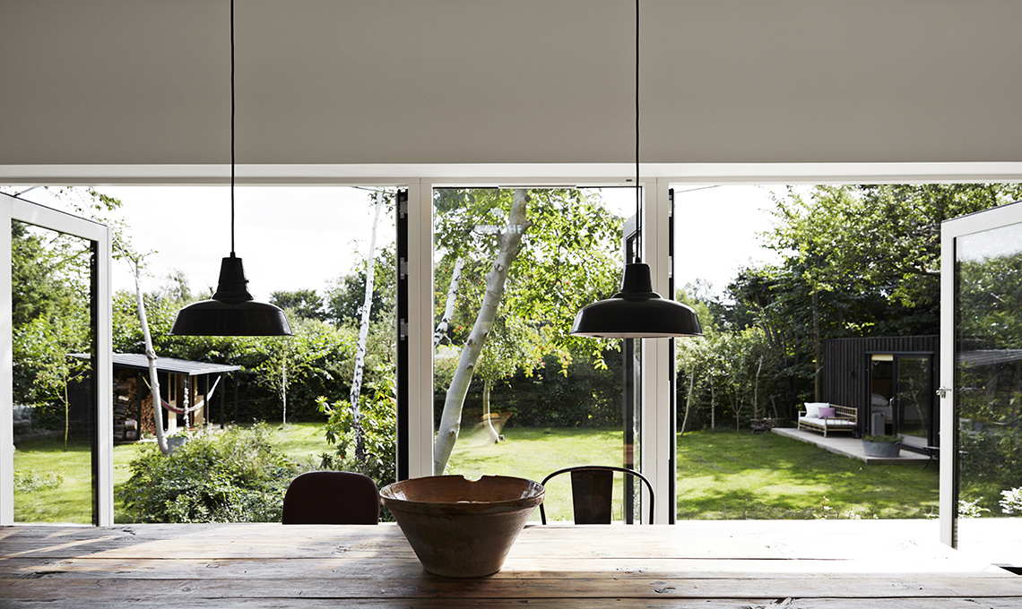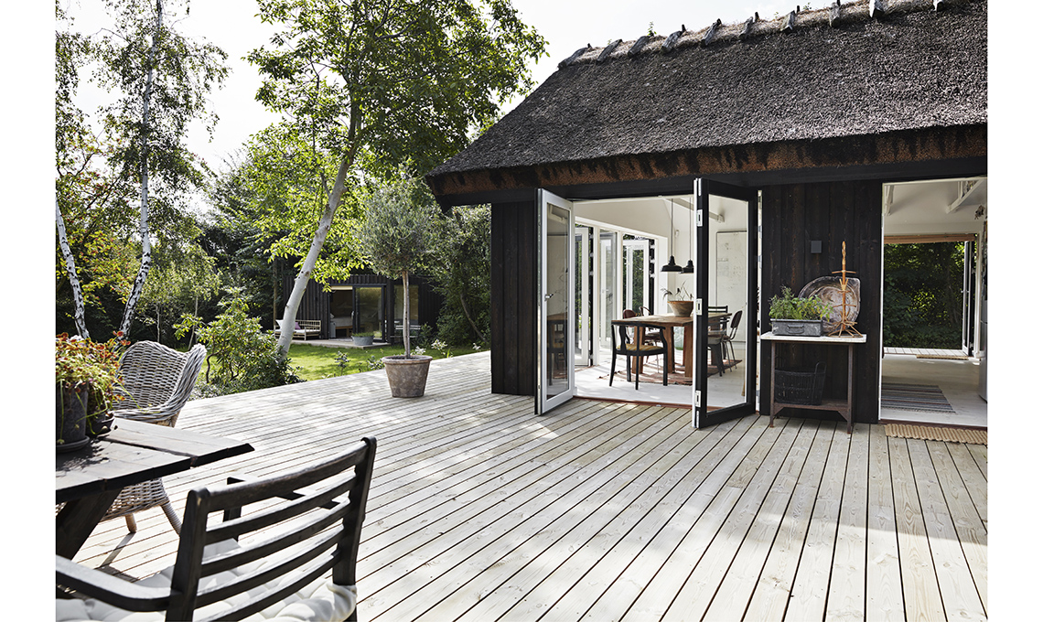 La pavimentazione in legno sbiancato continua all'esterno sulla terrazza in cui trova spazio la zona pranzo all'aperto.