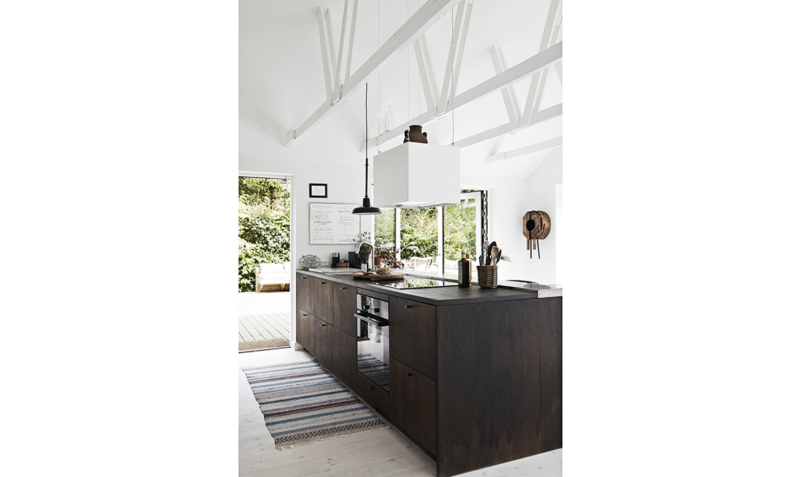 L’isola della cucina è stata sistemata al centro della zona giorno, a dividere il pranzo dal living. È l’unica presenza forte dell’ambiente e ospita fuochi, piano lavoro, forno e lavello.