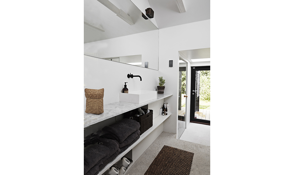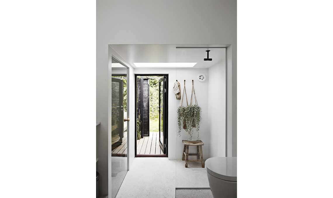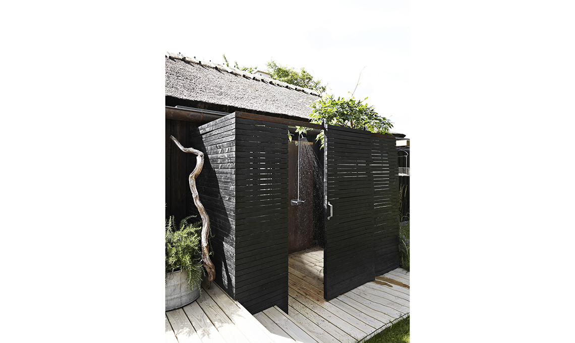La casa è stata pensata come uno spazio in continuo scambio tra in & e outdoor. Lo conferma il fatto che dal bagno si può accedere direttamente alla doccia esterna.