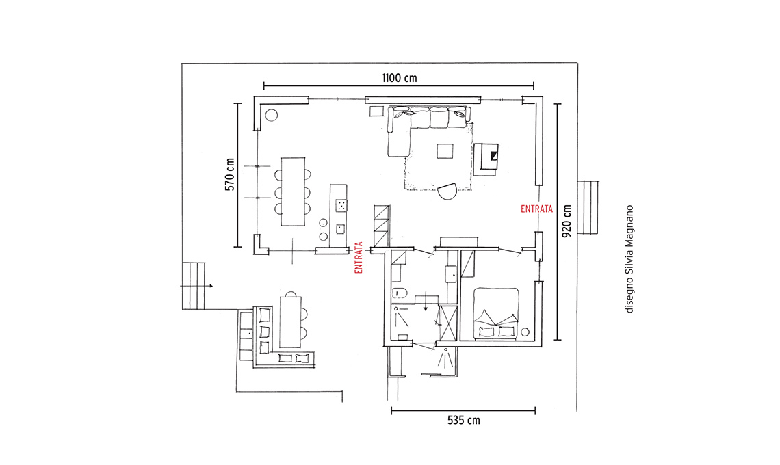 Progettando l’entrata del bagno dal soggiorno, è stata creata un’infilata bagno-bagno turco con doccia-doccia esterna molto funzionale.