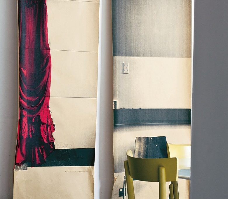 Srotolati e sospesi a sottili cavi di metallo, anziché applicati sull’intonaco, i due rolli di carta da parati Ballgown (a sinistra) e Day Too Chair (a destra) sembrano raccontare di mondi d’altri tempi. Entrambi di Deborah Bowness (m 3,3x56 cm €230 cad.)
