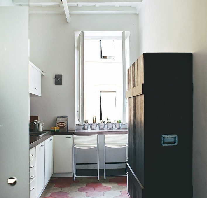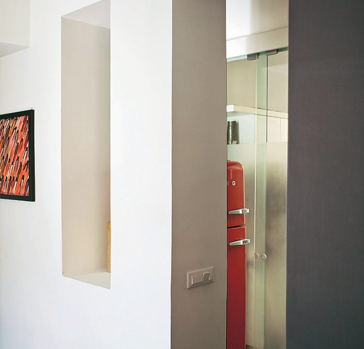 Sbirciare attraverso i varchi, scoprendo prospettive sempre mutevoli, è il gioco preferito di Emilia. Qui, poi, l’apertura consente la comunicazione fra la cucina e il pranzo. E fra le geometrie di muratura spunta, inatteso, il frigo (Smeg)!