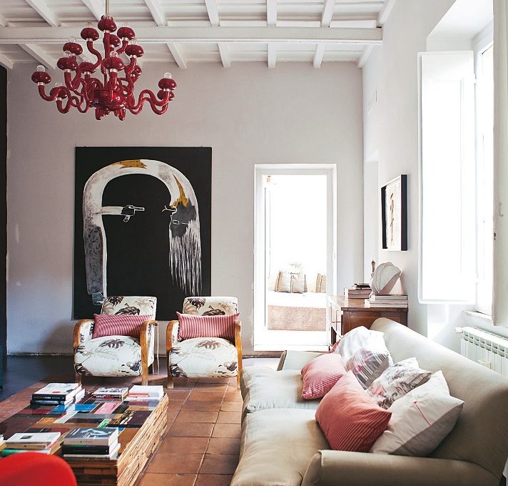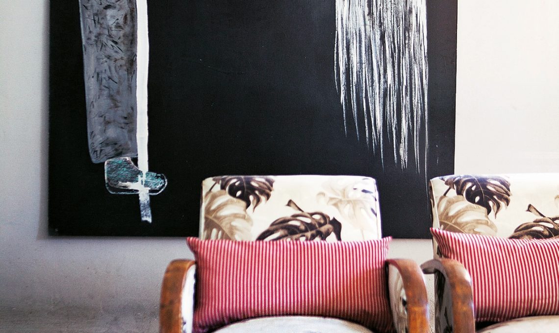 Davanti alla tela dell’artista Davide Monaldi (www.davidemonaldi.com), le due poltrone Anni Venti ritappezzate (tessuto Thompson) invitano a scambiarsi opinioni... magari sfogliando uno dei volumi sul tavolino.