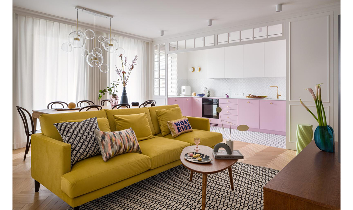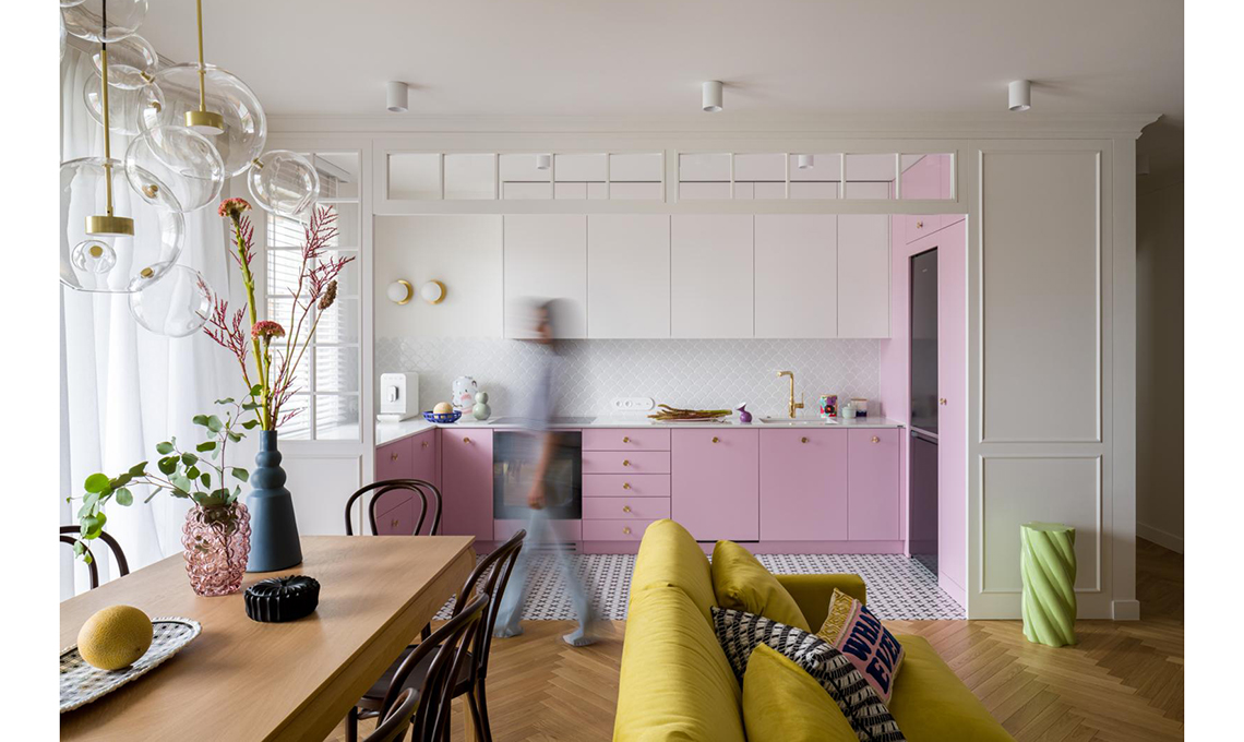 «Il rosa è una scelta inconsueta per la cucina e rischiava di diventare stucchevole, ma l’abbinamento con il divano di un luminoso giallo ha cambiato completamente la percezione del rosa, aggiungendo una nota pop» spiegano Aleksandra e Katarzina.
