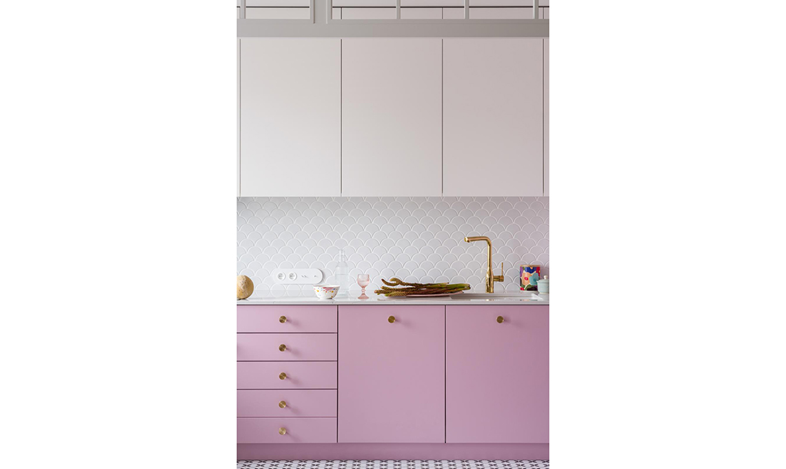 In cucina, pavimento Patchwork Clover Mirage [opoczno.eu] simile a Decorata di [Terratinta Group]. Piastrelle a squama di pesce su mosaicdelsur.com e mosafil.it. Cucina su misura. Il codice NCS del colore rosa della cucina è S 1515-R20B. Tappeto: lo metti davanti al divano? Sceglilo di almeno 20 cm più largo del divano stesso e appoggiaci sopra i piedi anteriori.