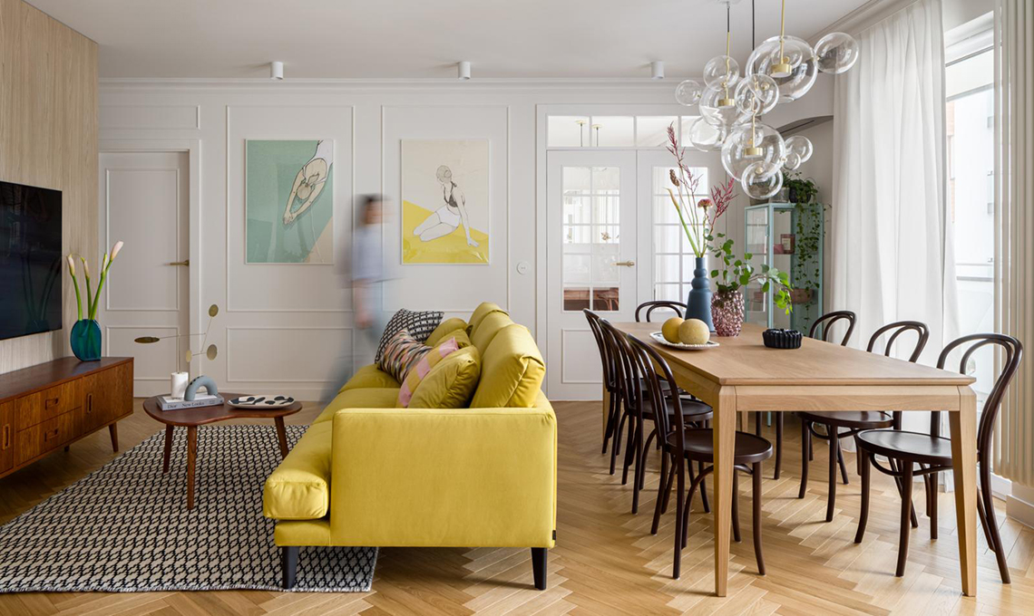 Siamo a Varsavia, ma... ricorda molto Parigi. Due giovani interior designer rivisitano l'eleganza francese con un uso scanzonato del colore. Avresti mai pensato rosa, giallo e vwerde abbinati al parquet e agli stucchi?