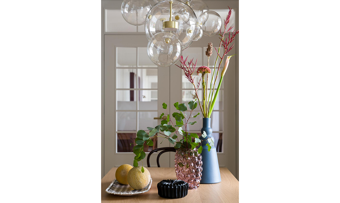 Sospensioni Adar Pendant [Bloomingville], sedie girevoli in stile Thonet Kontor 523 [Ton, su sedie.design], pomelli Bee M in ottone a forma di ape [su papdeco.com].