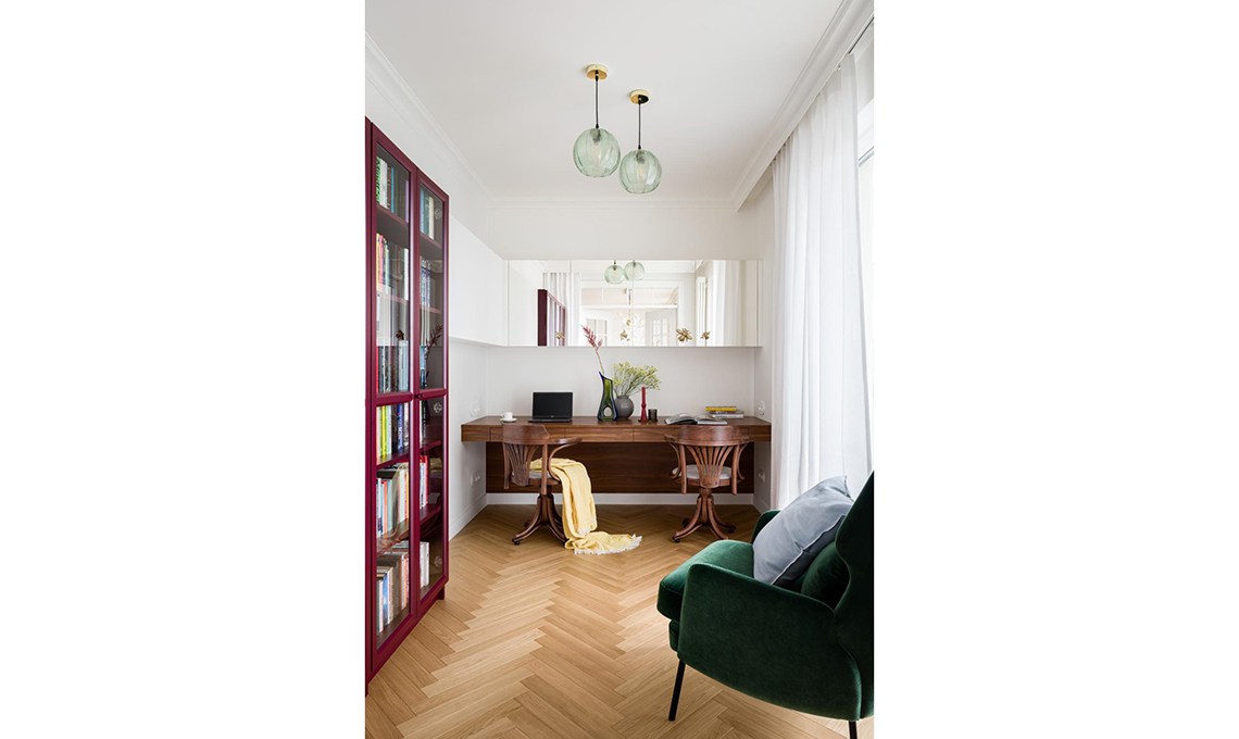 Effetto boiserie. «Il punto di partenza per il living? Creare uno sfondo che rendesse protagonisti gli arredi» raccontano Aleksandra e Katarzina. La parete bianca è stata arricchita con stucchi e modanature e battente che conduce allo studio dona un tocco di leggerezza. Sono tutte idee da copiare se ami uno stile classico ma non datato, che possa convivere con arredi di gusto moderno o anche di design. E se ti piace, un parquet posato a spina di pesce, in un’essenza chiara – in rovere, faggio o frassino – è la perfetta base per fare abbinamenti anche un po’ insoliti...