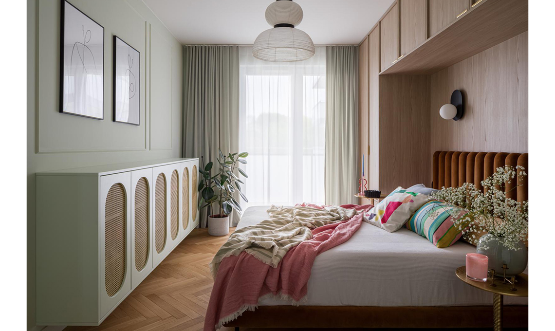Nella camera padronale (con bagno en suite) si è puntato su un verde molto chiaro e su elementi orientali come il lampadario in carta di riso e il mobile sospeso con ante in rattan. «È il protagonista della composizione di tutta la parete ed è davvero capiente!» dicono le progettiste all’unisono.