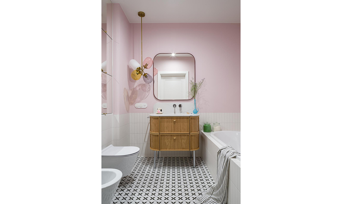 Lampada a sospensione Geoxa [su zfabryki.pl], piastrelle a parete Biscuit [41zero42], piastrelle a pavimento Patchwork Clover Mirage [» opoczno.eu]. Il mobile-lavabo è stato disegnato da Houmi Projecty. Curvilinei e in legno trovi i modelli Caldera [Maisons du Monde] e Rokia [Kave Home]. Il codice NCS del colore rosa della parete è S 1010-R10B.