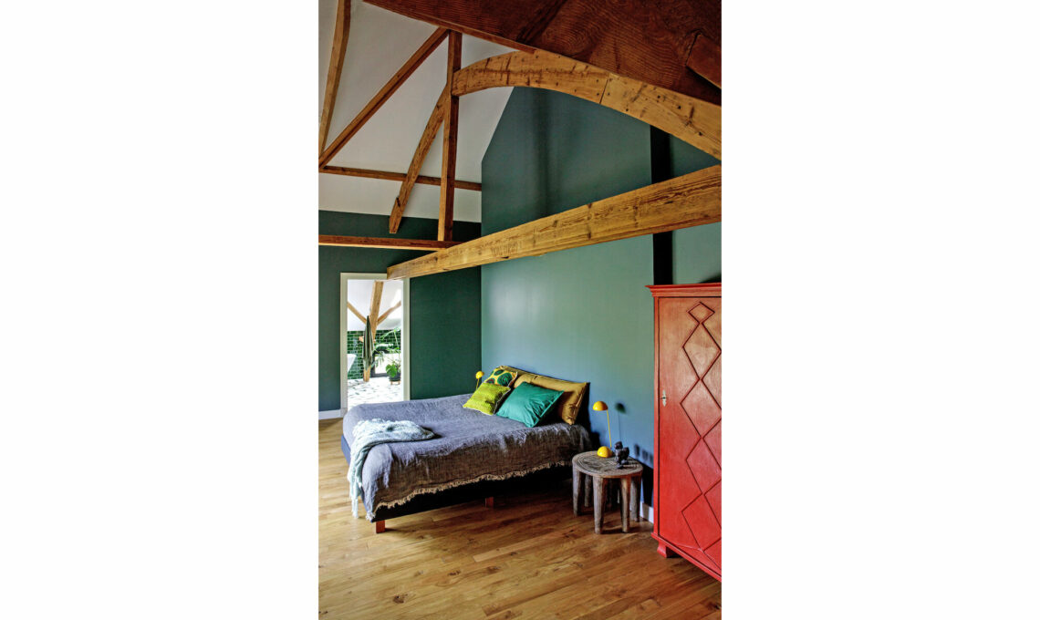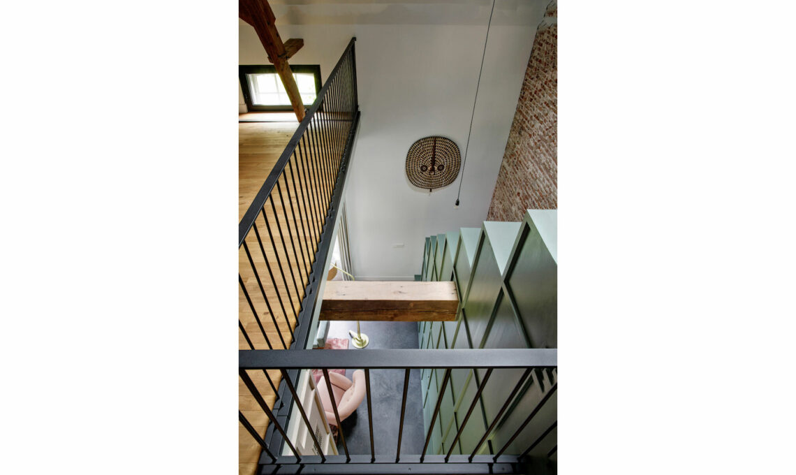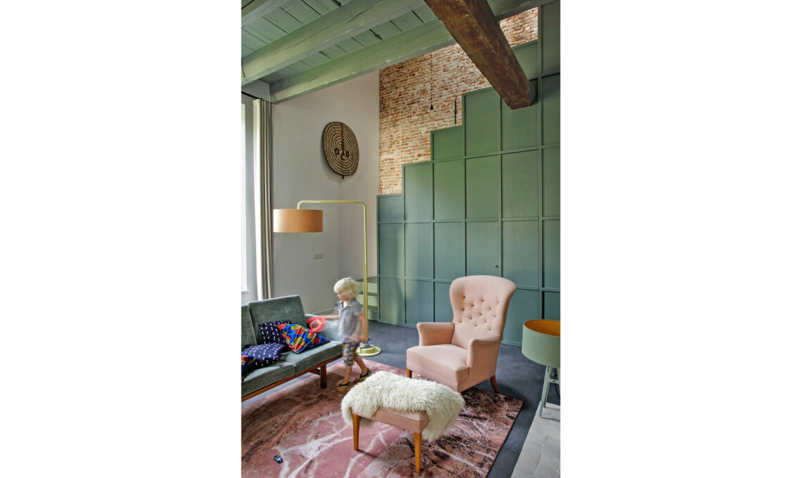 Il mobile accanto alla scala è protagonista della casa ed esalta, per contrasto, il muro antico; la palette verde salvia e rosa si accende in cucina e in camera (blu, rosso lacca, verde bosco). L’amore per il design, soprattutto olandese, ha guidato la coppia nella scelta dei mobili della casa.