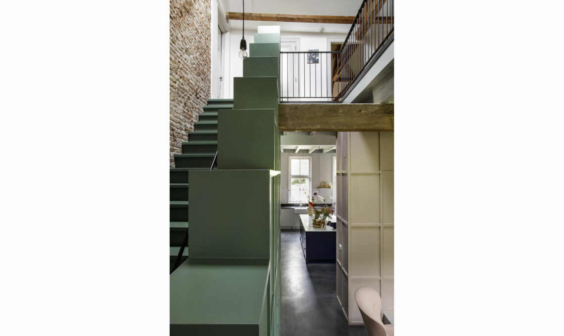 La scala con la balaustra in ferro opaco e il mobile-ripostiglio a gradoni sono realizzati da artigiani locali, su progetto di Mirte. Ti piace questo colore? è Green Smoke di [Farrow & Ball].