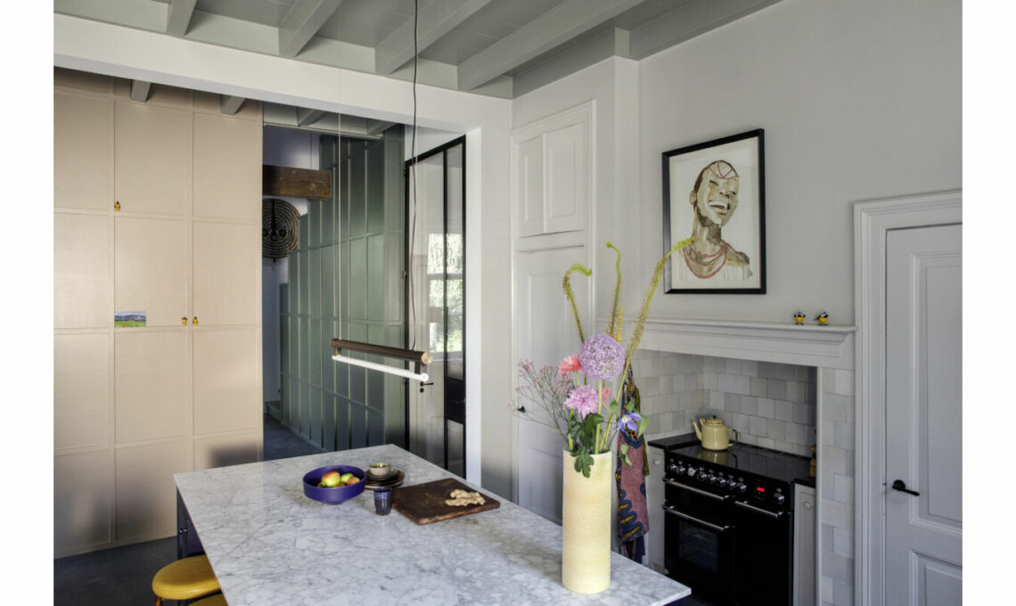 L’isola è realizzata in legno da un artigiano locale, su progetto di Mirte. Il colore è Dock Blue di [Little Greene] e top in marmo bianco di Carrara [su marmo granito.it], lampada a sospensione Eiffel [Frama €800], sedia Wiggle Side [Vitra €945], fruttiera di Geert Lap e vaso Bole [Cor Unum €305 e €348].