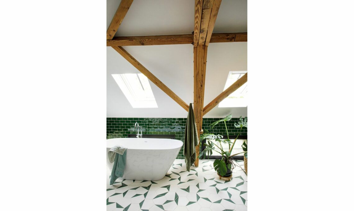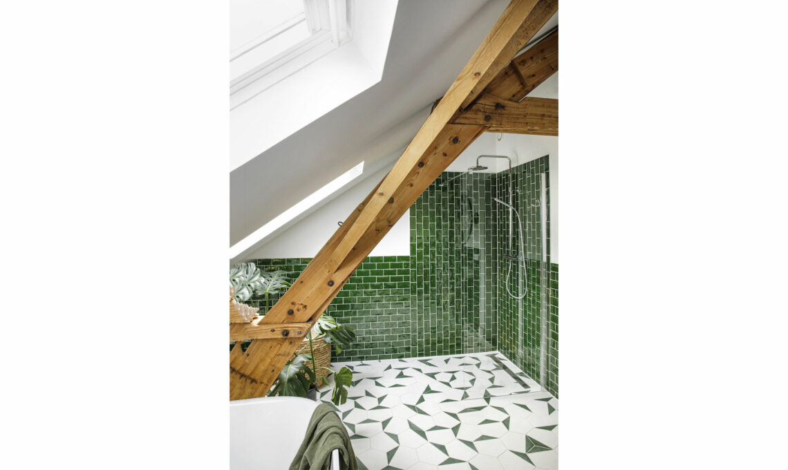 Per il bagno padronale, Mirte ha scelto il bianco e il verde, accostamento classico rinvigorito dalla forma delle piastrelle del pavimento: «Mi ero innamorata di un rivestimento decisamente fuori dalla portata delle nostre tasche», spiega. «Poi ho trovato un artigiano che realizza piastrelle di qualsiasi forma e colore. Le nostre hanno angoli appuntiti e sono posizionate – solo apparentemente – a caso. Siamo riusciti a creare esattamente l’effetto che volevamo!». Basta poco per rendere un bagno sorprendente...