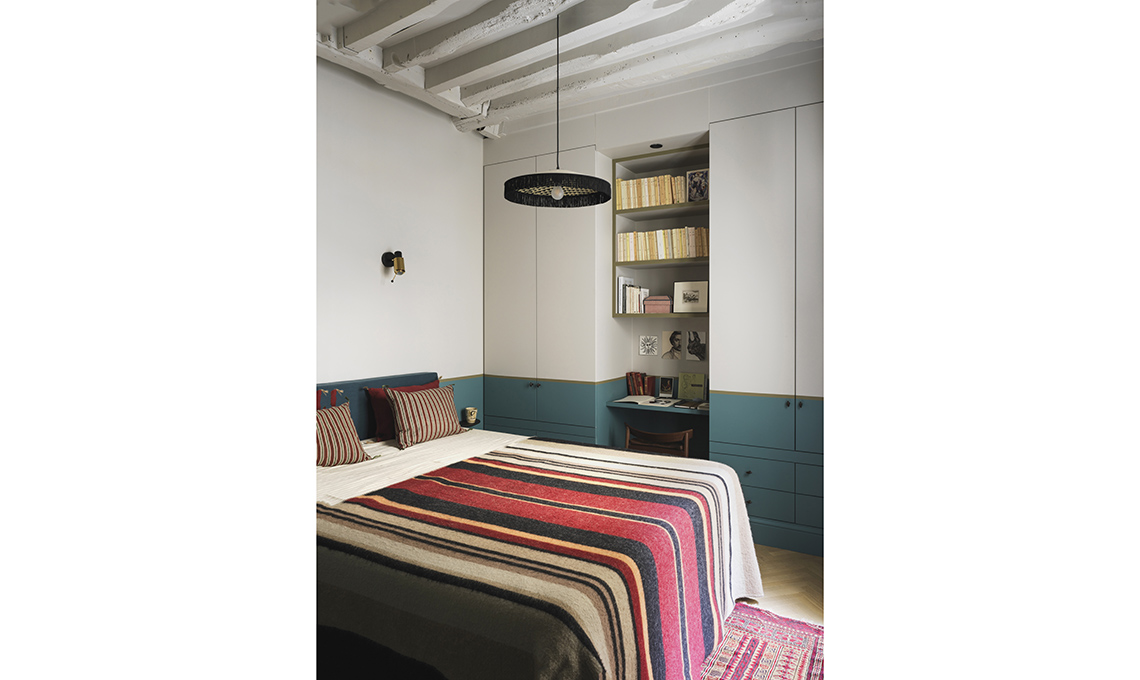 Le finestre interne mettono le stanze in dialogo fra loro: separate, ma unite. E l’uso del colore, be’, sfogliare per imparare! Chi segue Marianne anche su Instagram sa che più gli spazi si fanno mini, più la scelta deve farsi accurata: guarda le applique e gli interruttori rétro, l’assortimento di tessuti a righe e i tappeti kilim che fanno salotto in un angolo allestito con un sommier e qualche sgabello. Che appeal francese!