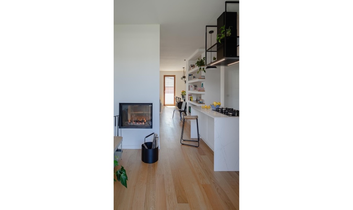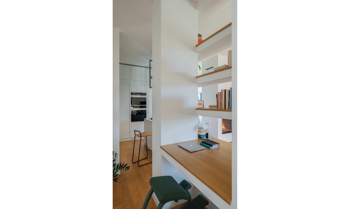 Del progetto iniziale rimane soltanto la posizione delle varie stanze, ridimensionate in modo da avere una zona giorno aperta ma con aree definite e autonome, un secondo bagno e una cabina armadio per la camera padronale. Le chicche? Aver inglobato pilastri e canne fumarie all’interno di armadi a muro e libreria a giorno che serve da filtro tra soggiorno, cucina e zona notte, così come aver inserito un camino bifacciale la cui fiamma è godibile da tutto il living.