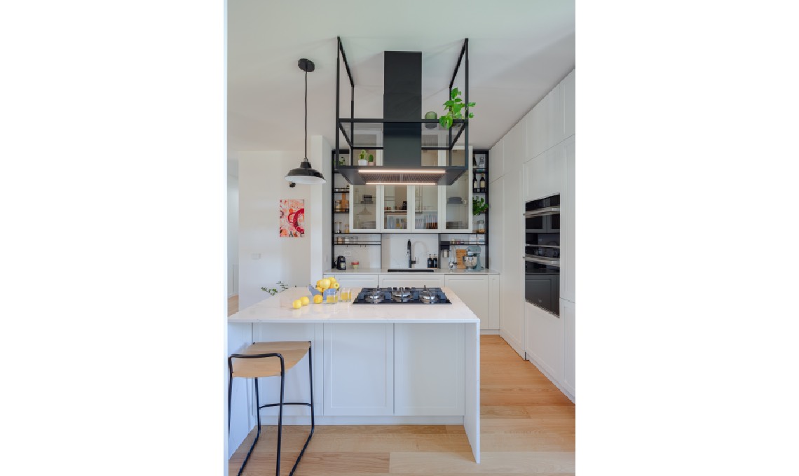 con il lavello è nascosta da una quinta e ‘mascherata’ dalla libreria. La finitura bianca delle ante consente ai mobili di mimetizzarsi con le pareti, i dettagli in metallo nero richiamano tavolo e sedie della zona pranzo. Cucina Carattere bianca con top in quarzo Neptun [Scavolini], forni [Hotpoint Ariston], cappa a isola [Fim], sgabelli Danske C [Extendo], quadro [Federica Pelini].