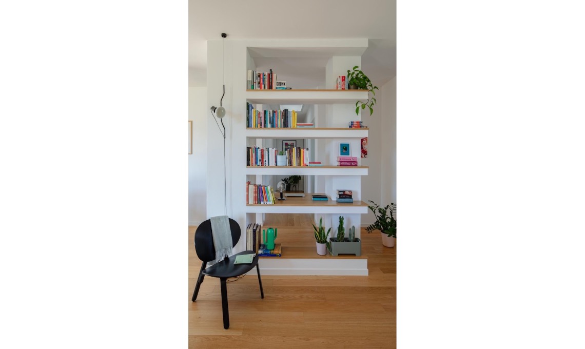 La libreria in cartongesso è completata da piani in rovere [Falegnameria Artigiana Frontonese] come il pavimento. Davanti è stato creato un angolo lettura. Lampada Parentesi, design Achille Castiglioni e Pio Manzù [Flos] e poltrona Fruste in impiallacciato tinto nero [Ikea, cm 59x57x74h].