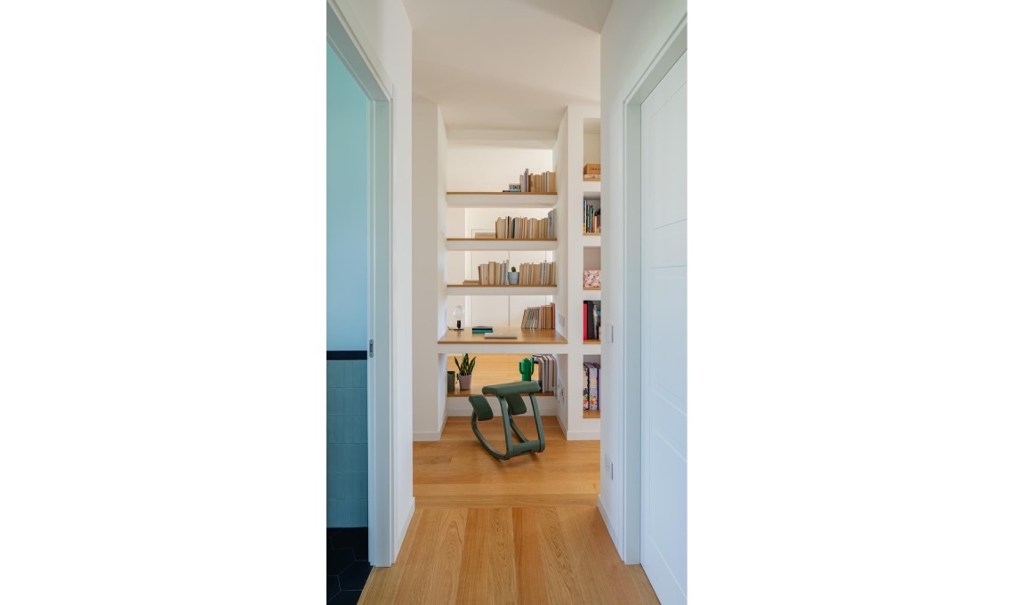 Il progetto che ha permesso di rendere i pilastri parte della libreria ha consentito anche di lasciare aperto il corridoio della zona notte su cui si affacciano tre camere e due bagni. Così la luce invade ogni stanza, senza vincoli.