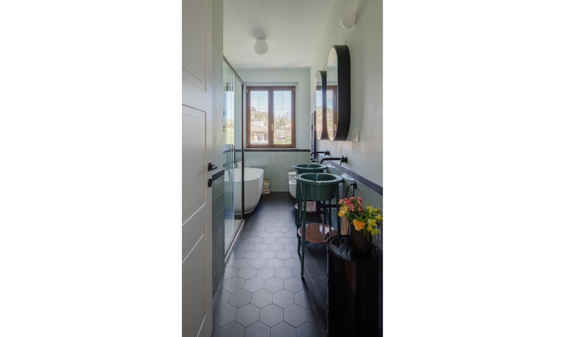 Sebbene la casa fosse grande, il progetto di partenza prevedeva un solo bagno: un vero peccato! «È bastato allargare quello esistente verso cameretta e cucina e poi dividerlo in due per avere una zona servizi davvero completa» racconta l’architetta. Quello principale ospita vasca, doccia e un doppio lavabo. Per creare un fil rouge con il living, Rubinetteria e cornice della boiserie sono nere opache a contrasto con il salvia e lo smeraldo lucido di pareti e lavabi. Vasca e piatto doccia in Luxolid® bianco opaco [Relax Design], cristallo doccia [Novellini], piastrelle Sixty Small Minibrick Nero Matt e Salvia Lux più Esagona Silktech antracite [Emilceramica], smalto colore 44js12 [Jsystem].