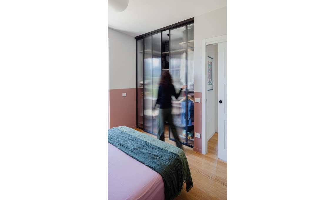 Di fronte al letto una nicchia accoglie la cabina armadio chiusa da pannelli e porte scorrevoli in vetro cannettato e ferro nero, in linea con il mood del resto della casa. Cabina armadio Doal [Zeus], Idropittura lavabile rosa 863js12 e bianco 32js12 [Jsystem].