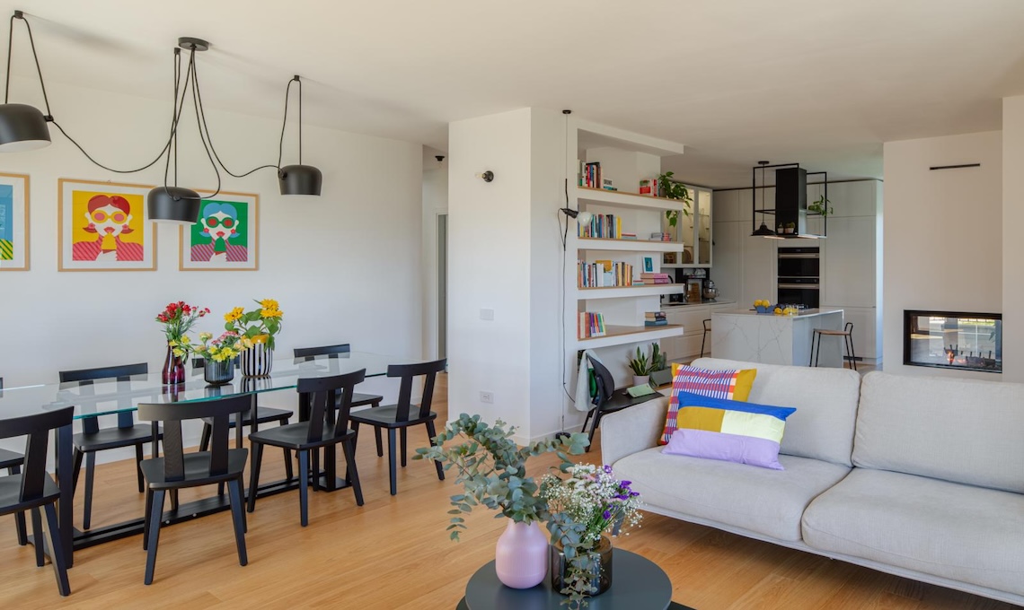 Per il living è stata scelta una palette neutra: il bianco e il nero giocano da protagonisti. Tavolo Accademia [Pointhouse] con sedie SP14 laccate nere [Sediarreda], lampade Aim [Flos], applique [Zangra]. La sospensione disegnata da Erwan e Ronan Bouroullec ha le luci posizionabili alle altezze desiderate. Le stampe di @olimpiazagnoli danno un twist colorato al pranzo.