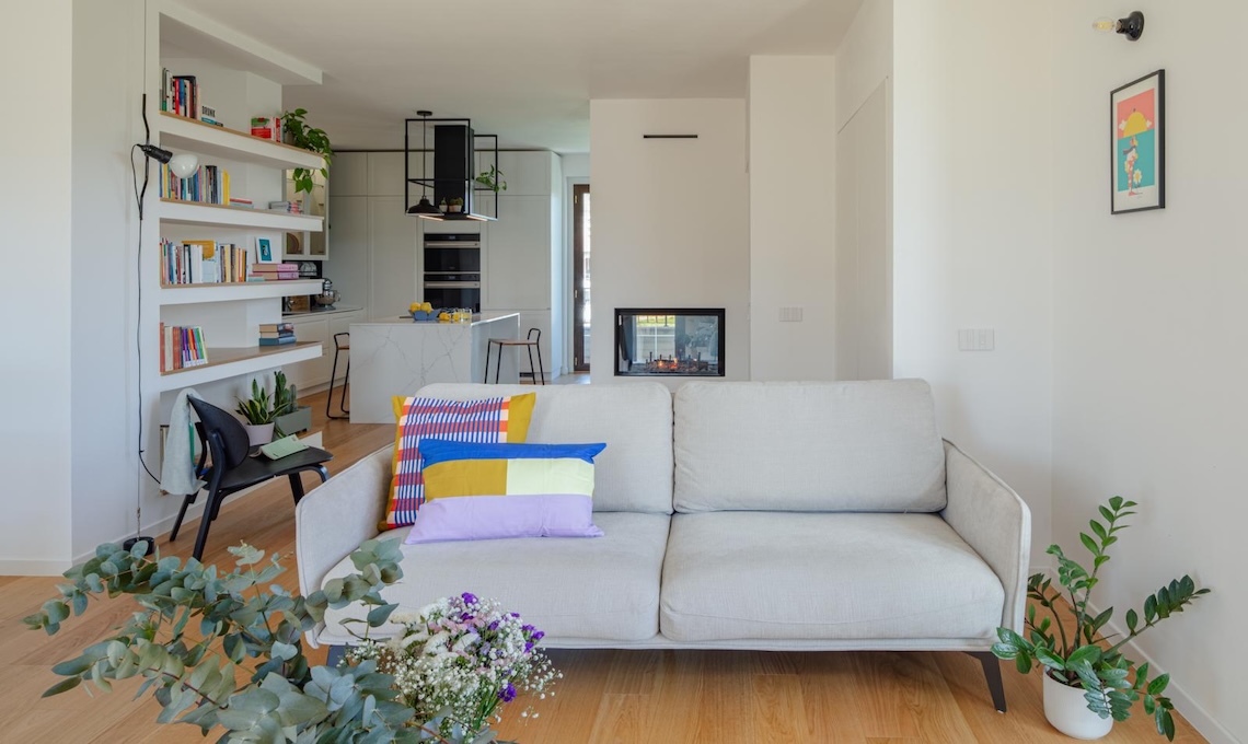 Tra cucina e soggiorno, proprio davanti all’ingresso ci sono un pilastro e una canna fumaria... Che fare? «Li ho ‘nascosti’ rendendoli parte integrante della libreria realizzata con mensole in cartongesso che serve anche da filtro tra le zone giorno e notte» dice l’architetta Francesca Pierucci. Divano Living Minimal [Samoa] con cuscini con fodere Tesammans [Ikea].