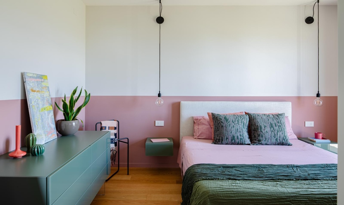 Alla zona giorno minimale in bianco e nero corrisponde una zona notte definita da una palette di rosa e verdi, delicati e avvolgenti.