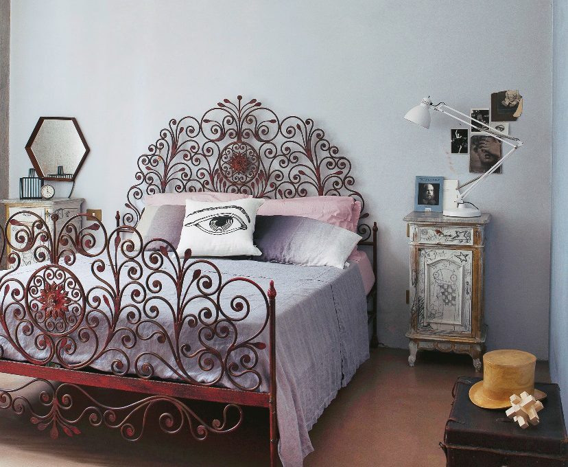 Vestono il letto: federe e lenzuola in grigio e rosa [Linum], cuscino con occhio dipinto a mano [Bottega dalla Tasca], cuscini bicolor [Madam Stoltz]. Baule e forma da cappello primi ’900 [100FA], decorazione geometrica [Paloma Props]. Il comodino decorato e il collage di fotografie vintage sono opera di Simona. Lampada da lettura Naska [FontanaArte € 313].
