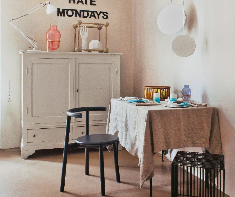 Sulla credenza: lampada da tavolo Naska [FontanaArte € 313], vaso in vetro e rame Titus I° [Paola C. € 500], mano in ceramica e Solidi platonici bianchi [Paloma Props], decorazione in legno Square monument [Madam Stoltz]. Sedia nera Solo [Mattiazzi € 364], tavolino-pouf Cubo [Antonino Sciortino], lampade a sospensione LT05 North [E15, da € 291], tovaglia in lino [Linum], cestino Basket [Paola C. € 230], piatti e bicchieri in ceramica Bicolor [Shop Saman, da € 10], vaso Titus III° [Paola C. € 220]. L’ironica scritta a parete è stata realizzata, molto semplicemente, ritagliando del cartoncino nero.