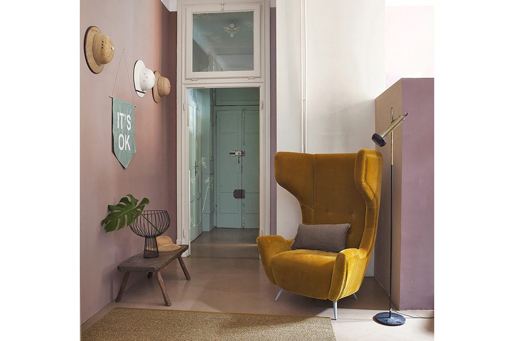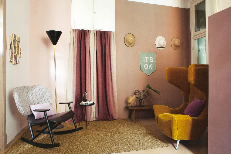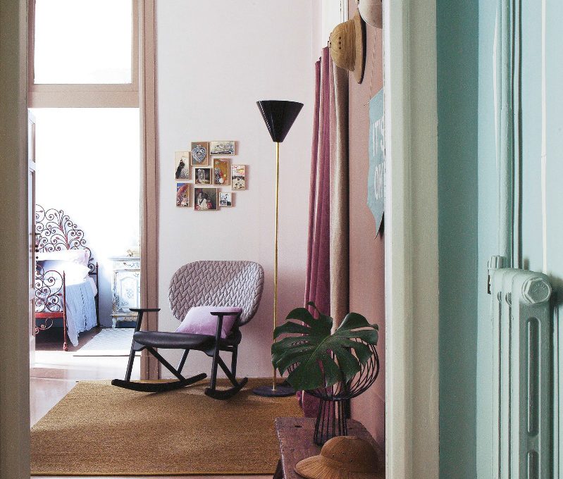 La tenda in lino Kalahari [Pierre Frey] si ispira alle nuances scelte per le pareti.A dare enfasi, alcuni arredi di diversa matrice: poltrona a dondolo Klara [Moroso € 1.885], cuscino [Madam Stoltz], lampada in ottone [Spazio 900], tavolino Habibi [E15, Ø cm 37x47h € 677], bergere in velluto [Spotti Edizioni by Studiopepe € 2.600], tappeto Glenn [Kasthall, cm 170x240 € 1.885].Lo stendardo è una creazione di Studiopepe.