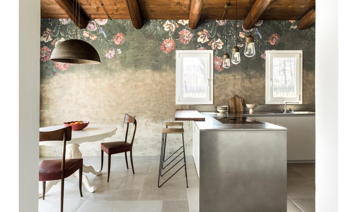 Ti piace l'effetto romantico della carta da parati? È Wallpaper Soul [Wall&Decò] dell’artista e designer Eva Germani: su supporto bio-vinile organico, in due finiture, effetto tessuto e sabbia. Il pavimento in grès effetto pietra e multiformato crea una base neutra che non appesantisce i soffitti o le pareti di sasso.