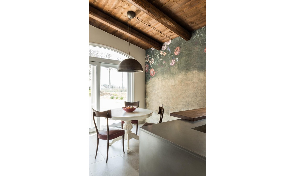 Tutto il progetto della casa colonica di Roberta, Alessandro e del figlio Giacomo a Forlì segue la linea del contrasto, ed è per questo che la cucina presenta piani e fasce di chiusura in acciaio: il metallo ‘rompe’ la linea romantica della carta floreale e quella calda, vecchia, delle travi ‘uso Fiume’, in abete, che su di esso si riflettono. Da un lato si aggiunge dall’altro si toglie, da un lato si riscalda dall’altro si raffredda. Il tavolo, della casa, è stato rimesso in sesto con una mano di bianco.