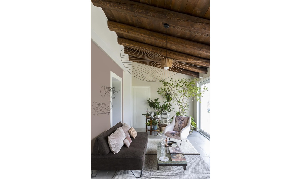 Nel salotto toni malva e grandi vetrate che aprono le stanze verso il giardino. L’architetta Giulia Prati ha allestito un angolo verde inserendo alcuni dei tanti dettagli che ‘fanno’ casa di inizio ’900: parti dai tavolini vintage, gabbietta per uccellini, statue, ampolle e cloche. Sospensione Vertigo, design di Constance Guisset [Petite Friture], divano su misura, tavolino in ferro dipinto da Eva Germani; di Eva Germani anche la stoffa che riveste la poltroncina: tutto in vendita da @succi_ creazionidinterni come le teste-trofeo di Alessandro Rizzi [Filodatorcere]. Piatto con fiore [Vetrofuso], campana con fiori stabilizzati [Bosco].