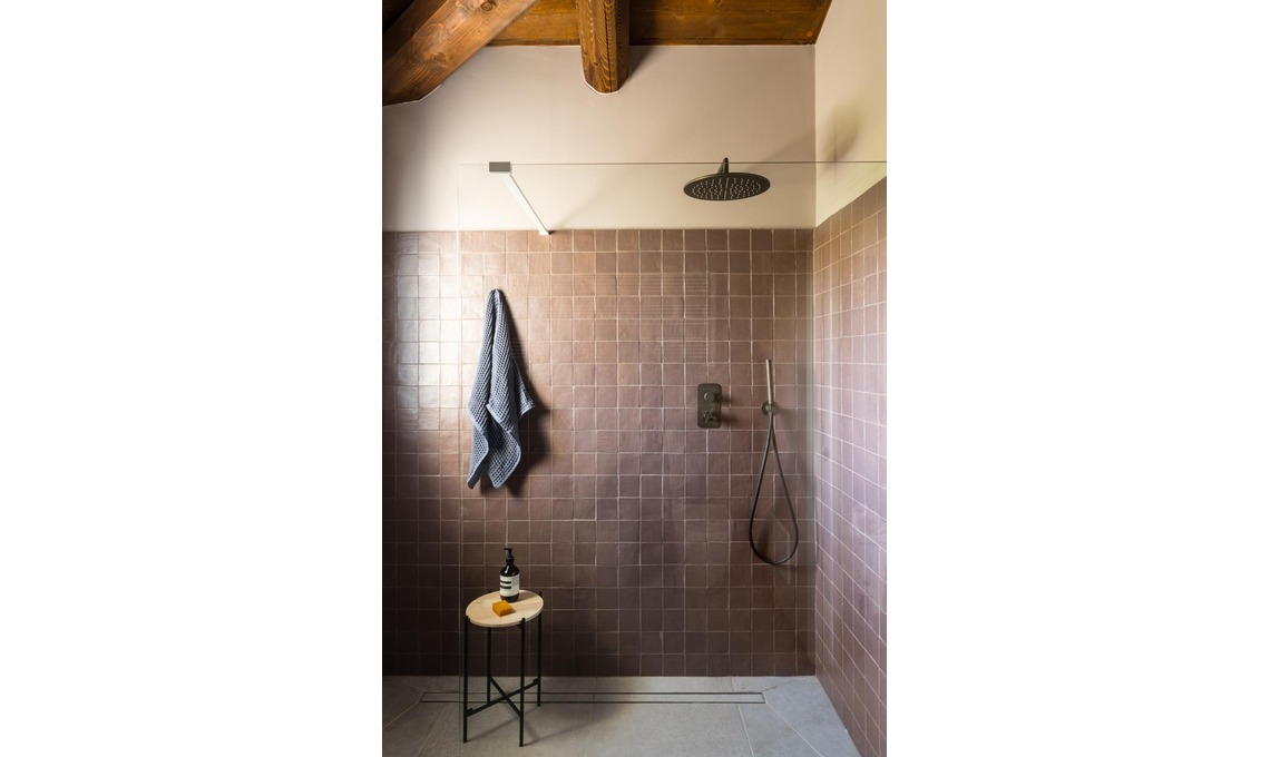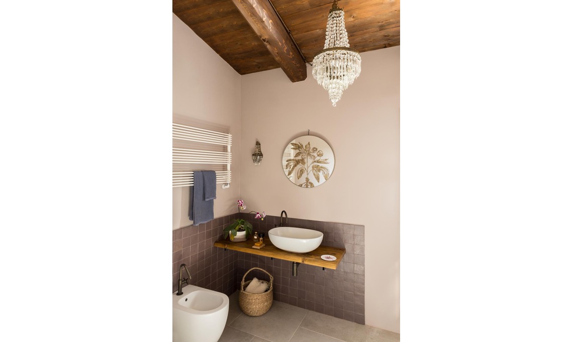 Il bagno è sorprendente nei suoi toni malva: l’architetta Giulia Prati ha chiesto all’azienda storica Pecchioli Firenze di produrre la loro linea Cotto del Mugello in formato 10x10 in questa inedita colorazione. Accontentata! L’atmosfera del bagno ne guadagna sensibilmente e tutto assume un’atmosfera onirica, quasi ovattata. Ad amplificarla, il rosa cipria delle pareti e le finiture brunite della rubinetteria che fanno pendant a quelle del vecchio chandelier. Il piano del lavabo? È una semplice asse di recupero spessa 8 cm. Sanitari [Alice Ceramica], lavabo [Nic Design], rubinetto in ottone Hugò con verniciatura colore dark brass [Geda Nextage].