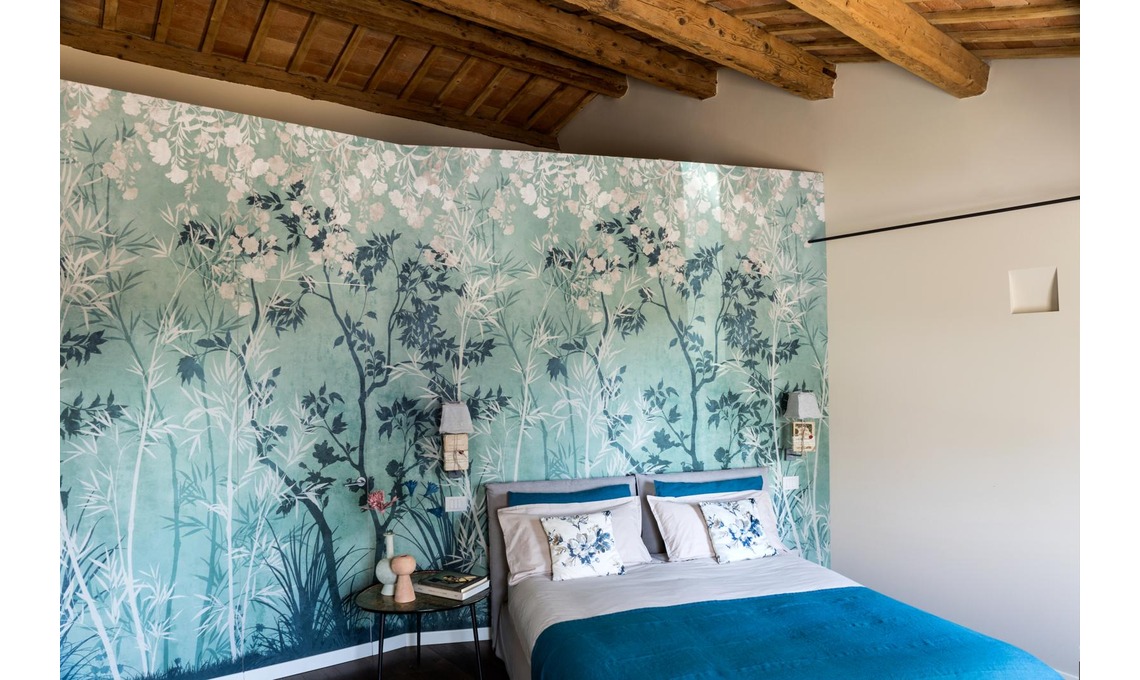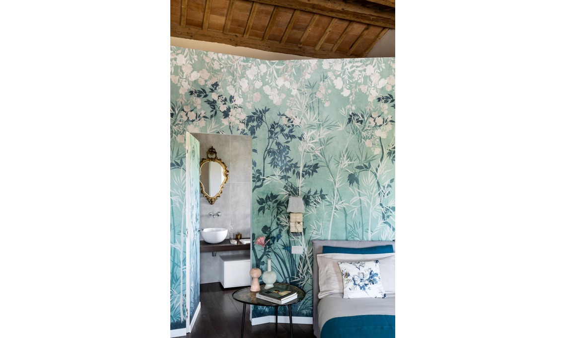 La parete rivestita dalla carta da parati ha una forma curvilinea per due motivi tecnici: il primo, permettere l’alloggio della vasca nel bagno retrostante; il secondo, ruotare il letto a favore della vista migliore che si gode dalla vetrata della stanza. Letto Lazy 015 [Flexteam], applique Readme [Borgo delle Tovaglie € 226], vasi [Federica Bubani], tavolino di Eva Germani.