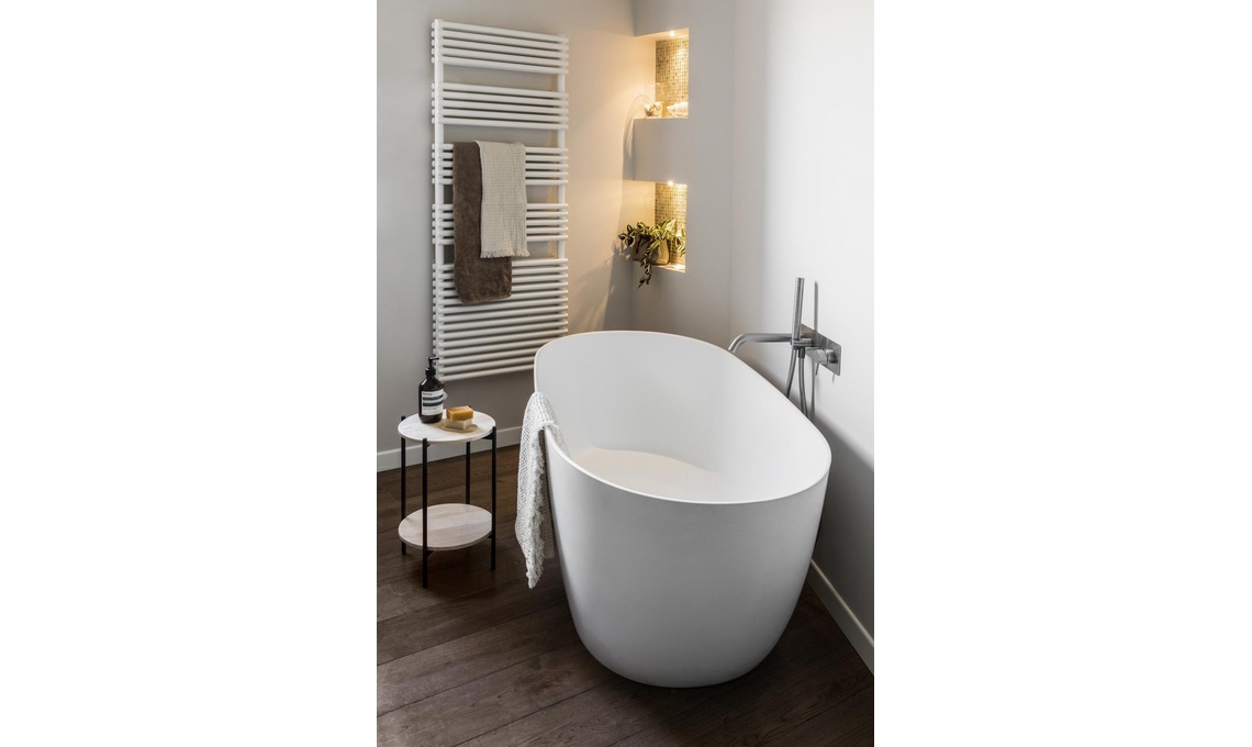 Bella l’idea delle nicchie con faretto e mosaico e la vasca freestanding servita da un coffee-table: le pareti, a parte la zona lavabo, sono pitturate a smalto, per un effetto setoso. Vasca Mara, freestanding, in Technolux bianco opaco [RCR].