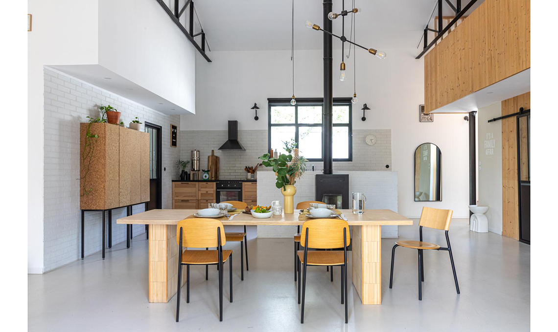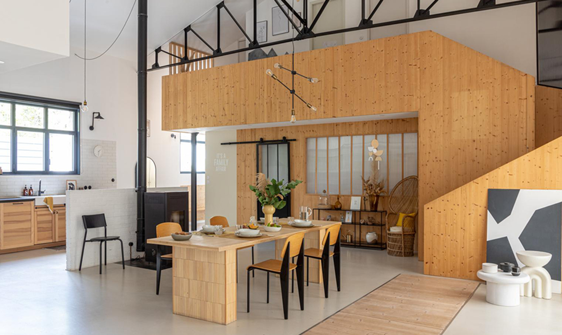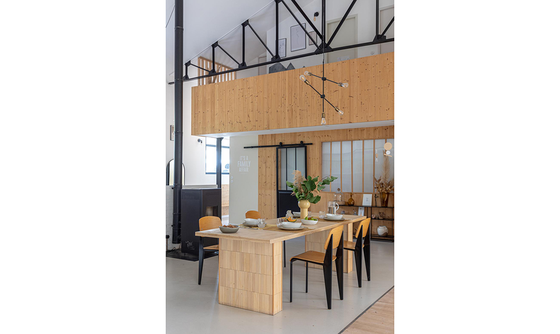 Dovendo mantenere lo scheletro in ferro, l'altezza di sei metri sotto il colmo ha suggerito l’idea di realizzare due soppalchi in legno di abete rosso per la zona notte, conservando un ampio e comodo spazio open centrale.